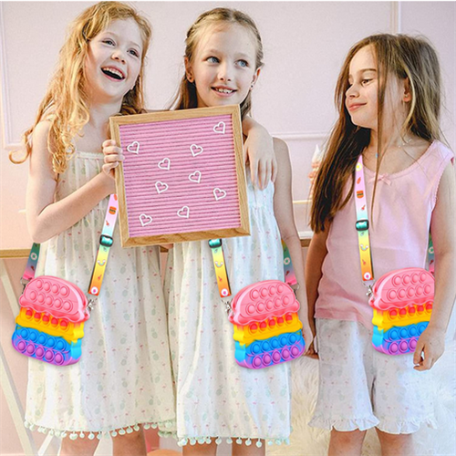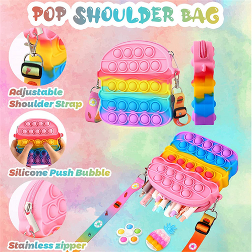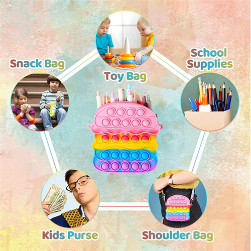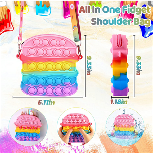 Pop rainbow shoulder bag a variety of shapes and designs, lovely appearance. Can be used as a daily storage backpack, coin purse, shoulder bag, suitable for shopping, party, and travel use. It can also be used as a pop sensory toy to relieve stress, release anxiety, restore emotions and get rid of boredom. Suitable for people suffering from autism, anxiety, etc.