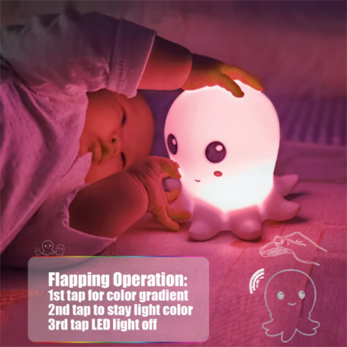 Cute octopus animal shape and warm and soft lighting make it easier for children to fall asleep while playing.The color changing night light has 7 colors,just touch and tap the silicone night light to change color.